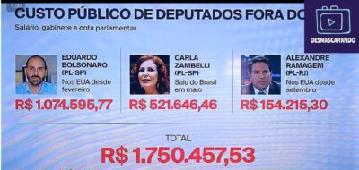 Fora do Brasil há meses e sem o direito de exercer seus mandatos como deputados, Alexandre Ramagem (PL-RJ), Eduardo Bolsonaro (PL-SP) e Carla Zambelli (PL-SP) continuam custando aos cofres públicos. Levantamento da GloboNews indica que a Câmara dos Deputados desembolsou R$ 419,3 mil com os três somente em outubro.